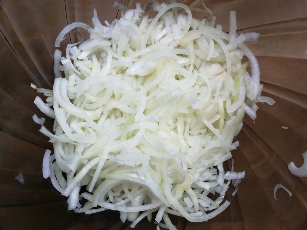 - Obraną cebulę pokroić w półplasterki i lekko zgnieść rękami.