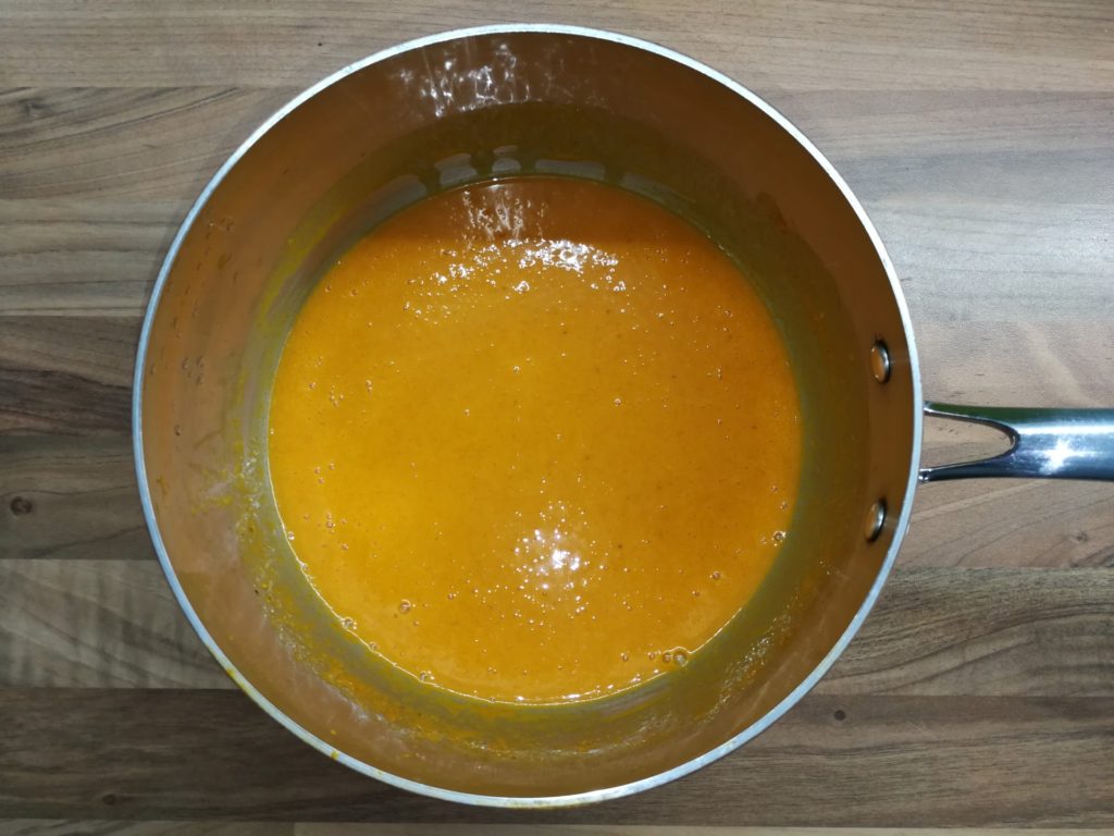 - Dokładnie przetrzeć przez sitko. Uzyskaną pulpę przełożyć do garnka z grubym dnem.