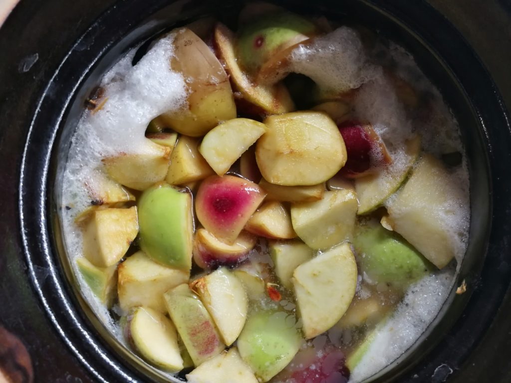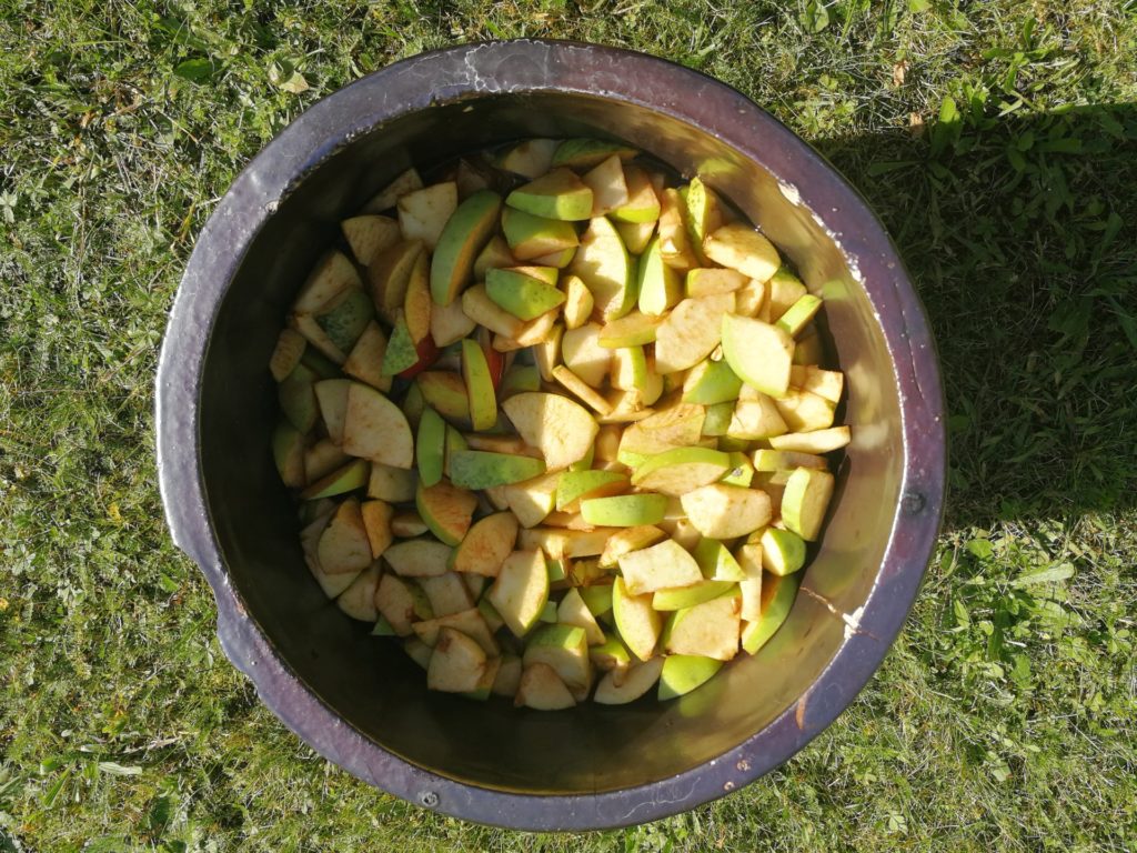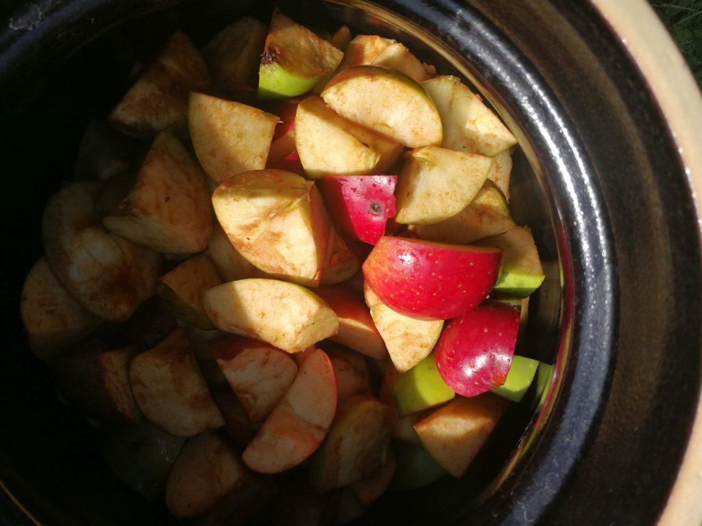 - Rozpuścić cukier w wodzie i zalać płynem pokrojone w grube kawałki jabłka.