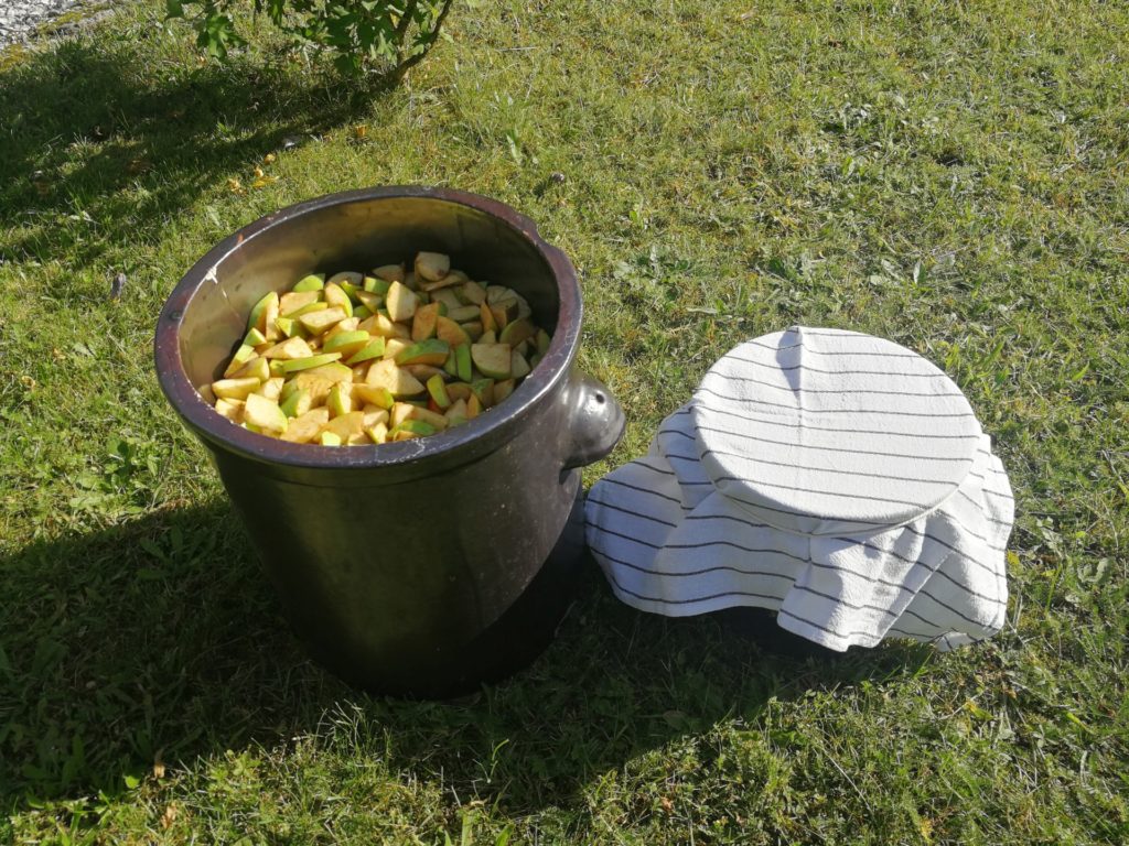 - Owoce przykryć talerzykiem i przycisnąć czymś ciężkim (np. słoikiem wypełnionym wodą). Istotne aby na powierzchni nie pływały kawałki jabłek.